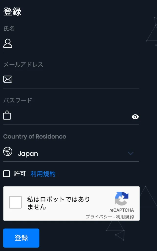 アクセスするとアカウント情報を入力する画面が出てきますので、「氏名」、「メールアドレス」、「パスワード」、「居住国」を入力します。