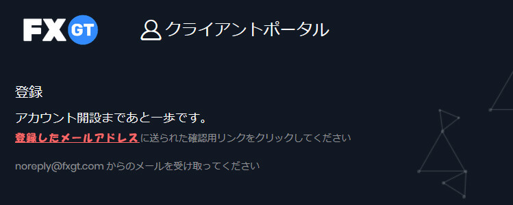 確認が終わると、登録したメールアドレスにFXGTからメールが届きます。